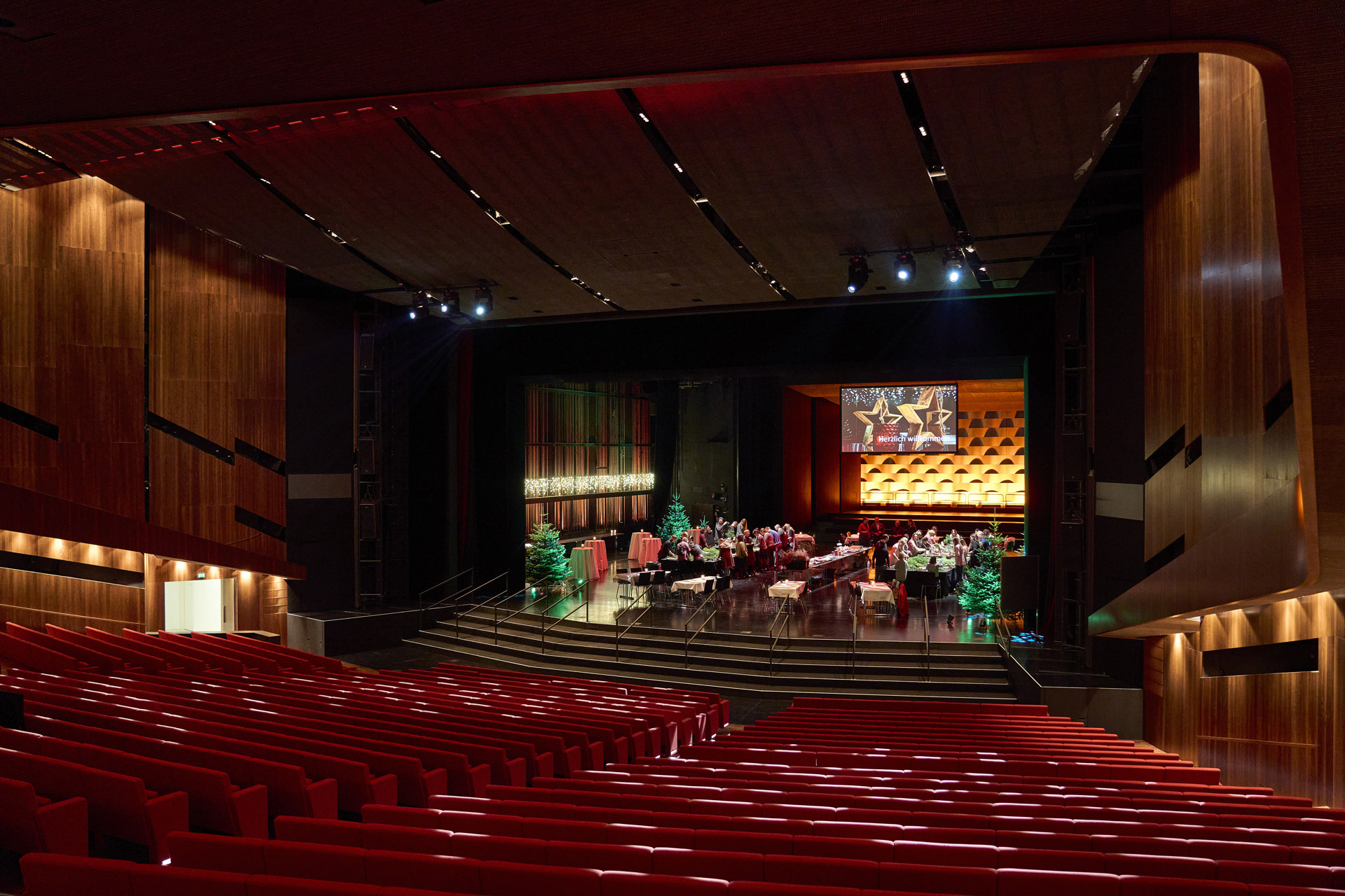 The combination of the Großer Saal, with Vor,- Hinter- und Seitenbühnen allows for highly flexible spatial concepts and bespoke settings – ideal for conferences, corporate events, gala dinners, or high-end networking events. An event launch, for instance, can be dramatically choreographed via a targeted curtain reveal in the Hauptbühne. A technical highlight is the 20-metre diameter revolving stage, offering dynamic spatial movement and ever-changing perspectives – even in real time during live events. Equally compelling is the view into the fly loft and stage tower, which can be custom-lit to reflect your corporate identity or desired ambience. The mobile orchestra shell can be employed either as an integral stage element or as a decorative feature to enhance the overall visual composition.