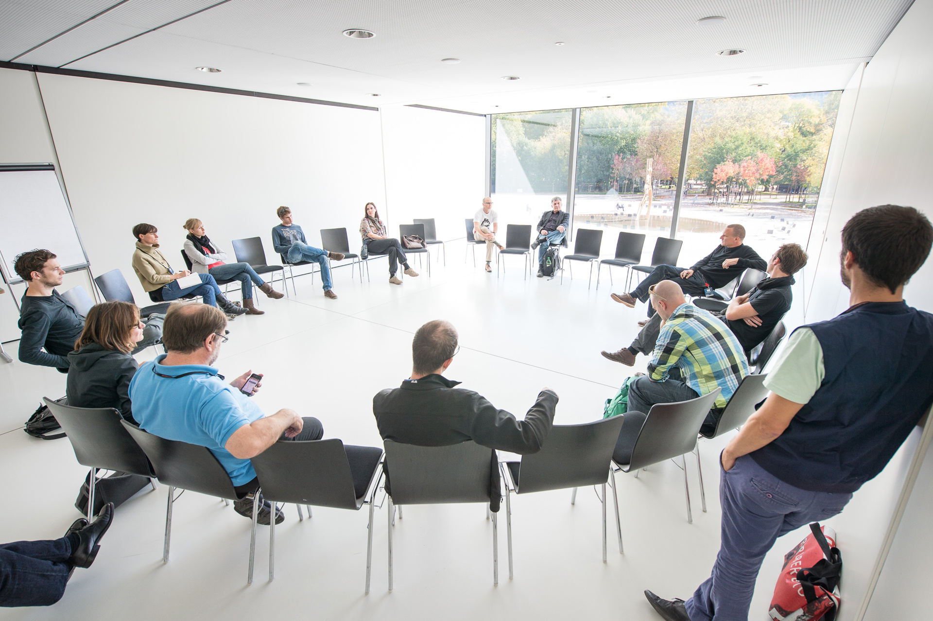 Workshop-Teilnehmer:innen in einem Stuhlkreis im Saal Bodensee im Festspielhaus Bregenz