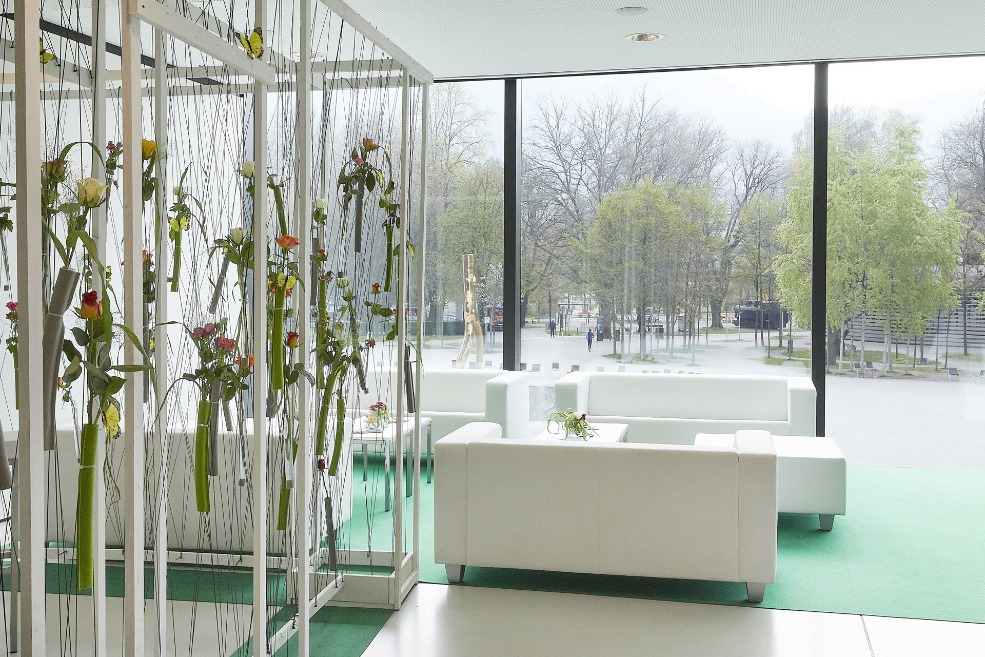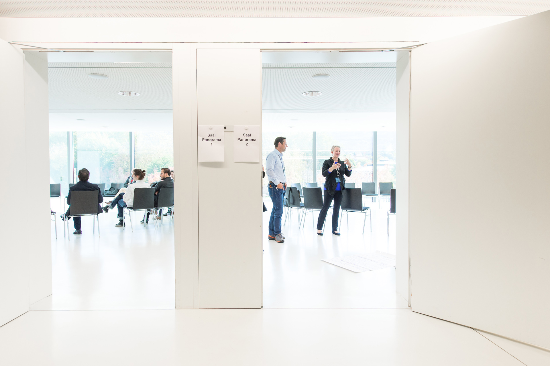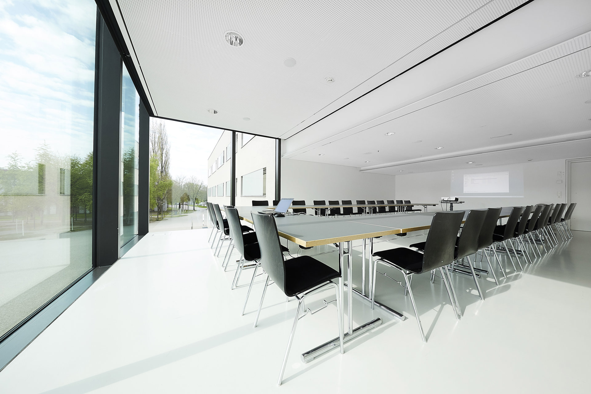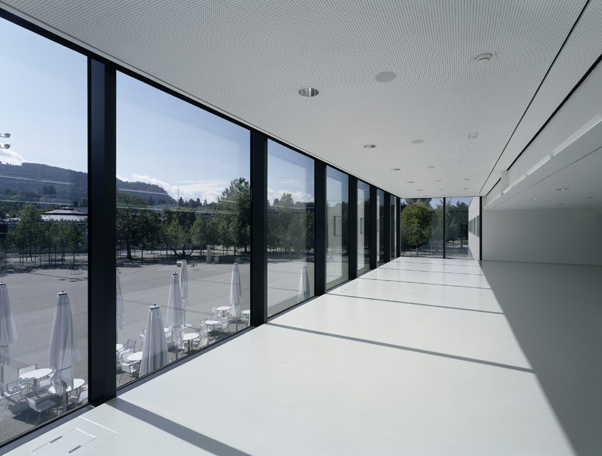 With its fully glazed wall, the Saal Panorama has a wonderful panoramic view of the Platz der Wiener Symphoniker, the town and Pfänder mountain. The room seats around 150 people and adjoins the Saal Bodensee. The two rooms are connected by a double door, allowing them to be used in combination.