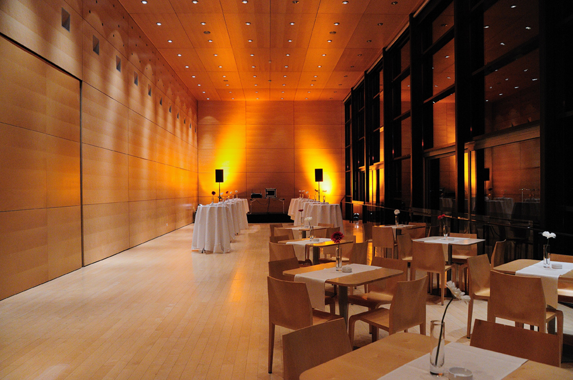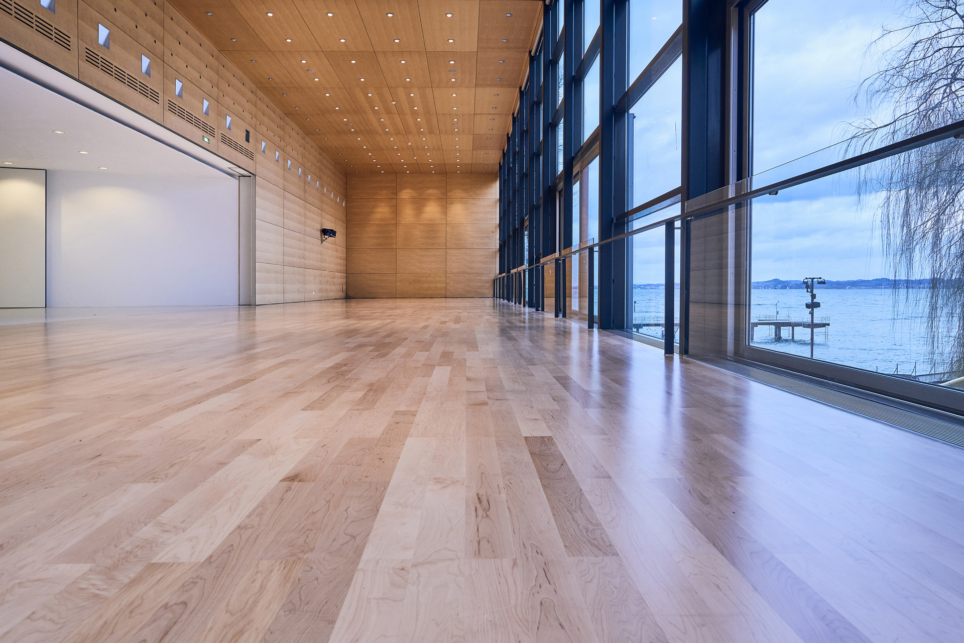 If you’re looking for an event space with that certain something, then you will love the Seefoyer (lake foyer). Its glass facade affords an unobstructed view of the Bregenz Festival’s impressive lake stage as well as the surrounding mountains and the island town of Lindau. The light-coloured maple wood and the generous room height of six metres add to the room’s spacious feel and ambience.