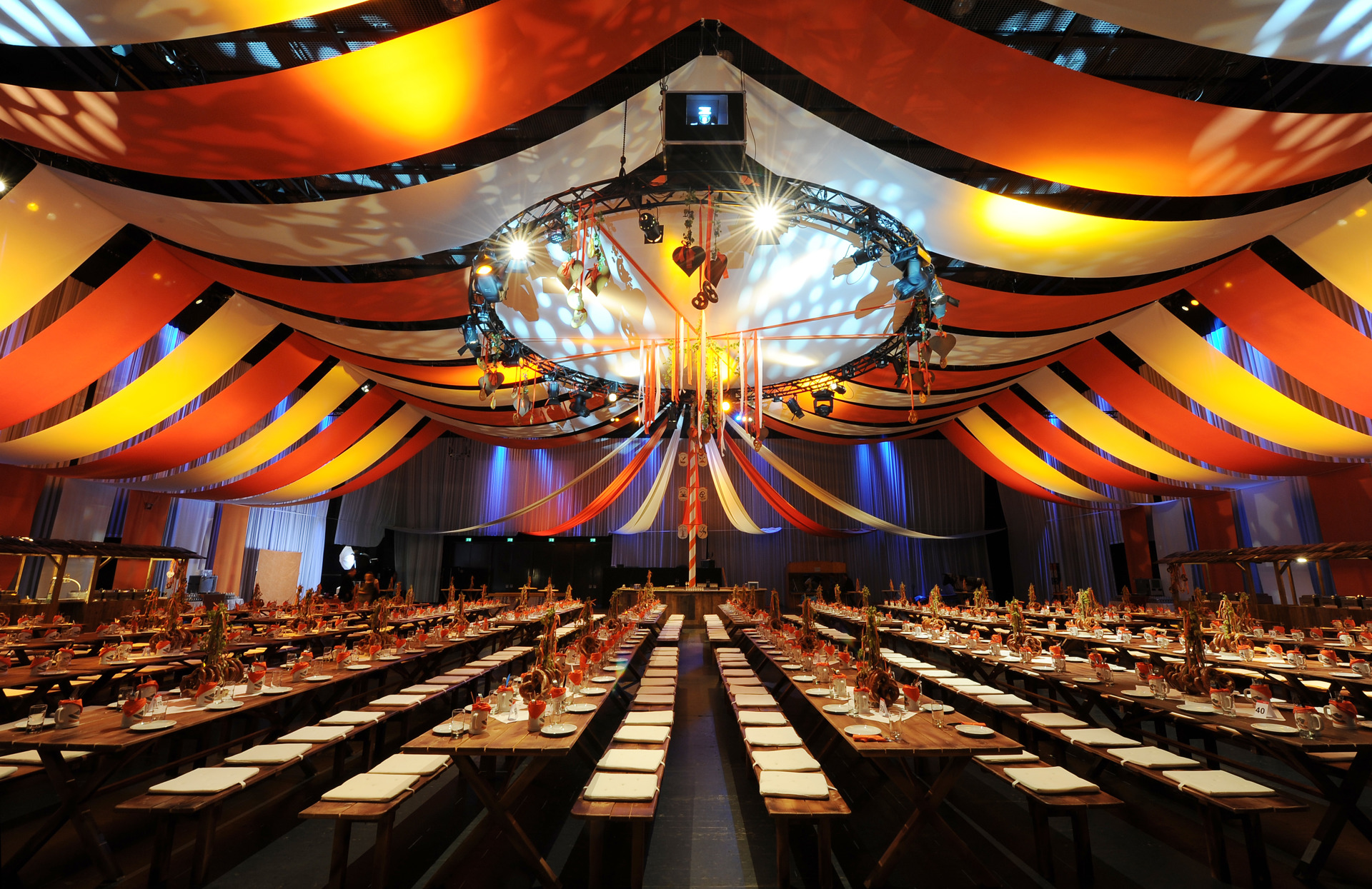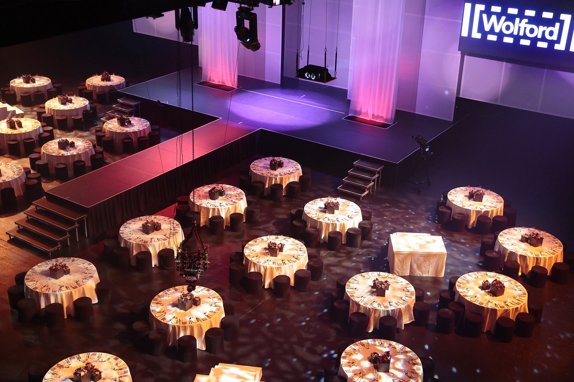 Festlich eingedeckte Tische auf der Werkstattbühne im Festspielhaus Bregenz